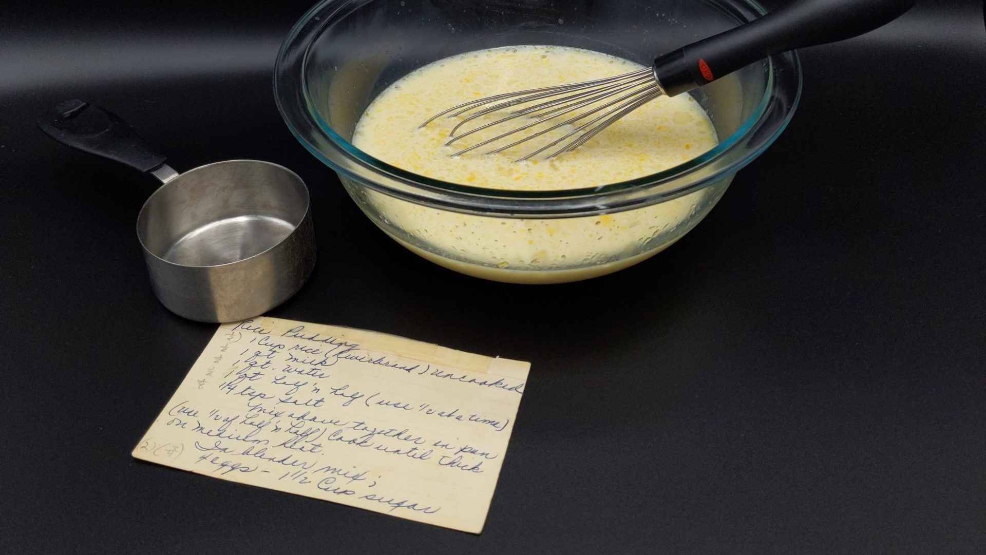 Unsurprisingly, when I was cataloguing the hundreds of recipes that she saved, I found four different recipes for rice pudding. I chose to make the one I deemed the most “classic.” Kay wrote it out on an index card and I believe it could have been a recipe from the River Rice brand, but I haven’t quite been able to find anything that matches it exactly. The original recipe she wrote had double the amounts for each ingredient, though she very helpfully halved them right on the card!